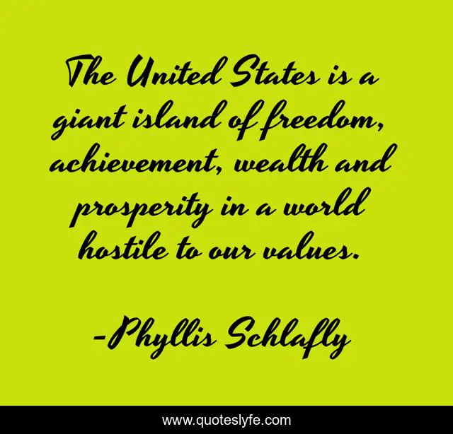 This page presents the quote "The United States is a giant island of freedom, achievement, wealth and prosperity in a world hostile to our values.". Author of this quote is Phyllis Schlafly. This quote is about world, wealth, achievement,.