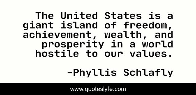 This page presents the quote "The United States is a giant island of freedom, achievement, wealth, and prosperity in a world hostile to our values.". Author of this quote is Phyllis Schlafly. This quote is about prosperity, wealth, island, values, united-states, freedom, achievement,.