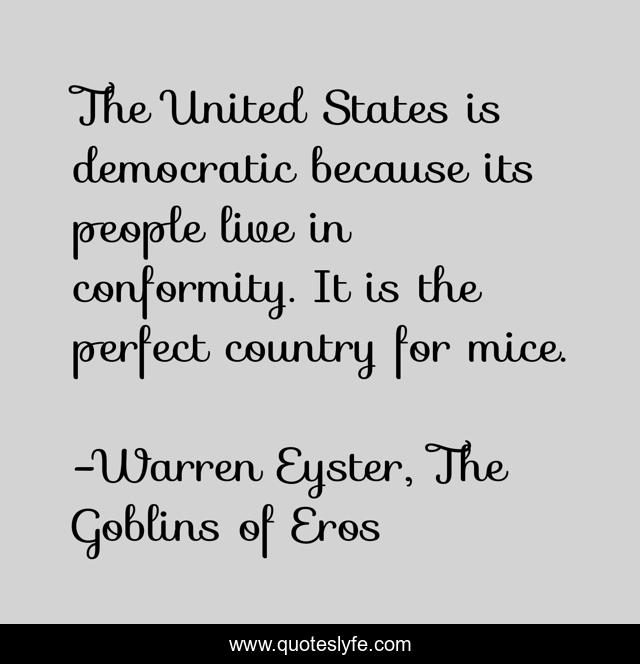 This page presents the quote "The United States is democratic because its people live in conformity. It is the perfect country for mice.". Author of this quote is Warren Eyster, The Goblins of Eros. This quote is about democracy, mexico, united-states, united-states-of-america, conformity, of-mice-and-men,.