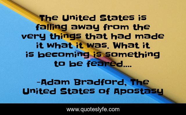 This page presents the quote "The United States is falling away from the very things that had made it what it was. What it is becoming is something to be feared....". Author of this quote is Adam Bradford, The United States of Apostasy. This quote is about end-times, return-of-christ, christianity, prophecy, america, islam,.