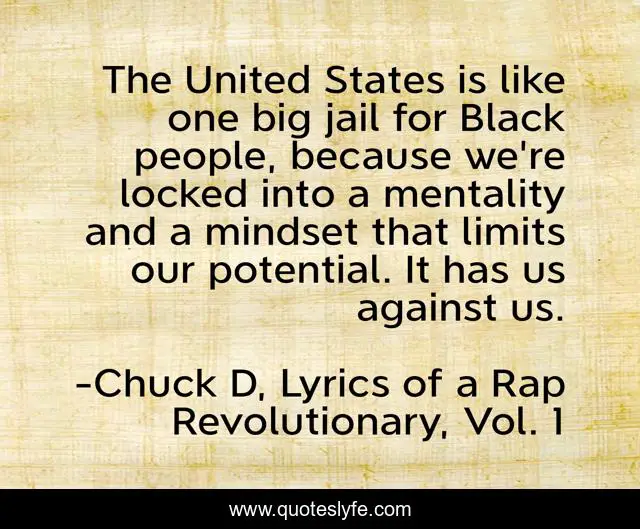 This page presents the quote "The United States is like one big jail for Black people, because we're locked into a mentality and a mindset that limits our potential. It has us against us.". Author of this quote is Chuck D, Lyrics of a Rap Revolutionary, Vol. 1. This quote is about black-steel-in-the-hour-of-chaos, public-enemy, racism, 1988, racism-in-america, race-relations, jail, united-states, prison,.