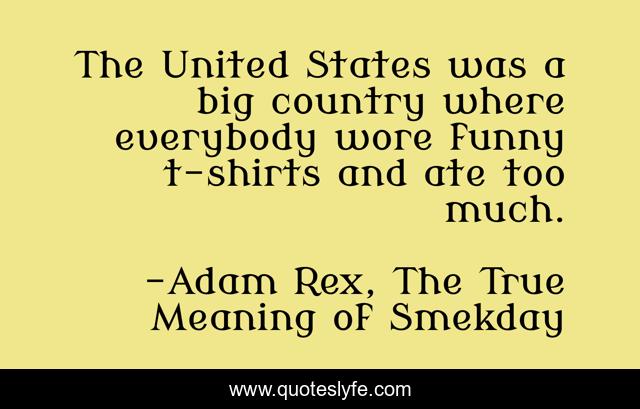 This page presents the quote "The United States was a big country where everybody wore funny t-shirts and ate too much.". Author of this quote is Adam Rex, The True Meaning of Smekday. This quote is about demotivational, america, humor, united-states,.