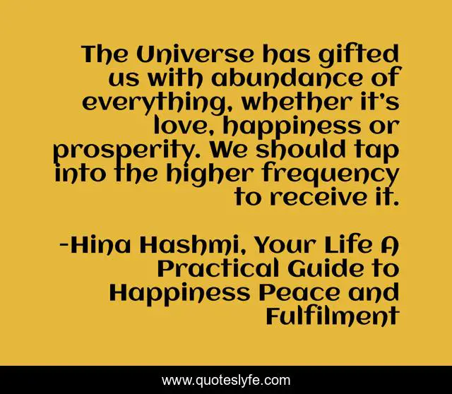 This page presents the quote "The Universe has gifted us with abundance of everything, whether it’s love, happiness or prosperity. We should tap into the higher frequency to receive it.". Author of this quote is Hina Hashmi, Your Life A Practical Guide to Happiness Peace and Fulfilment. This quote is about law-of-attraction, mindset-matters, change-your-thoughts,.