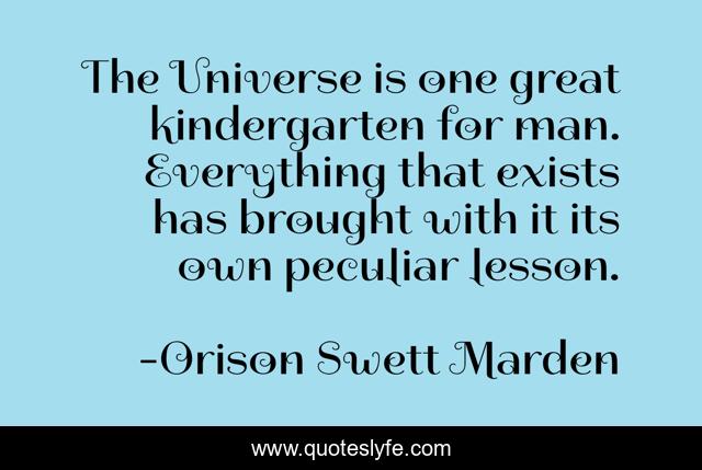 This page presents the quote "The Universe is one great kindergarten for man. Everything that exists has brought with it its own peculiar lesson.". Author of this quote is Orison Swett Marden. This quote is about universe, great, man,.