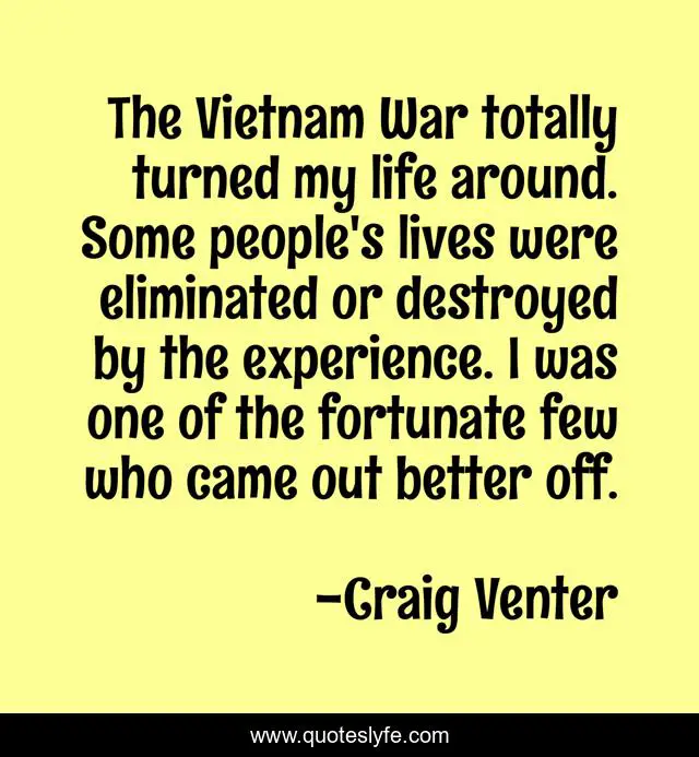 This page presents the quote "The Vietnam War totally turned my life around. Some people's lives were eliminated or destroyed by the experience. I was one of the fortunate few who came out better off.". Author of this quote is Craig Venter. This quote is about life, experience, people,.