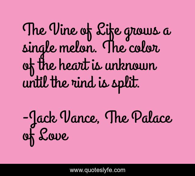 This page presents the quote "The Vine of Life grows a single melon. The color of the heart is unknown until the rind is split.". Author of this quote is Jack Vance, The Palace of Love. This quote is about aphorism, 1967, navarth,.