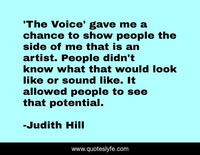 This page presents the quote "'The Voice' gave me a chance to show people the side of me that is an artist. People didn't know what that would look like or sound like. It allowed people to see that potential.". Author of this quote is Judith Hill. This quote is about me, artist, people,.