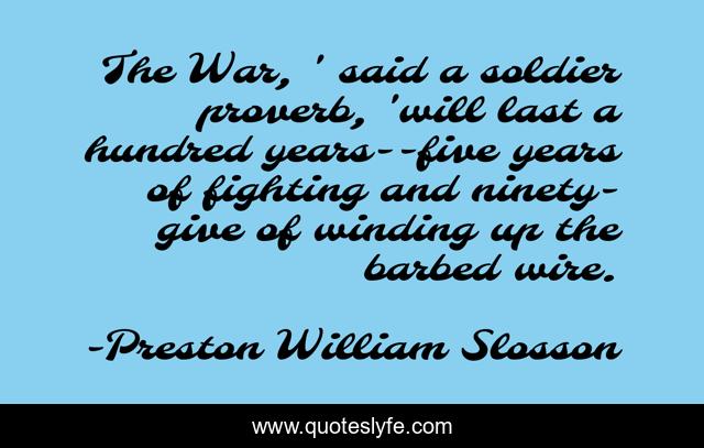 This page presents the quote "The War, ' said a soldier proverb, 'will last a hundred years--five years of fighting and ninety-give of winding up the barbed wire.". Author of this quote is Preston William Slosson. .