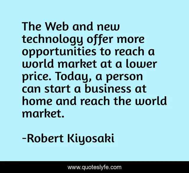 This page presents the quote "The Web and new technology offer more opportunities to reach a world market at a lower price. Today, a person can start a business at home and reach the world market.". Author of this quote is Robert Kiyosaki. This quote is about home, business, today,.