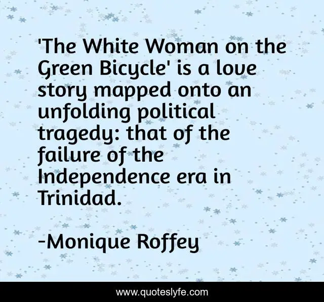 This page presents the quote "'The White Woman on the Green Bicycle' is a love story mapped onto an unfolding political tragedy: that of the failure of the Independence era in Trinidad.". Author of this quote is Monique Roffey. This quote is about woman, love, tragedy, affection,.