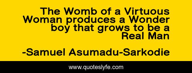 This page presents the quote "The Womb of a Virtuous Woman produces a Wonder boy that grows to be a Real Man". Author of this quote is Samuel Asumadu-Sarkodie. This quote is about proverbs, words-of-knowledge, discernment, parables, words-of-wisdom, inspiration,.
