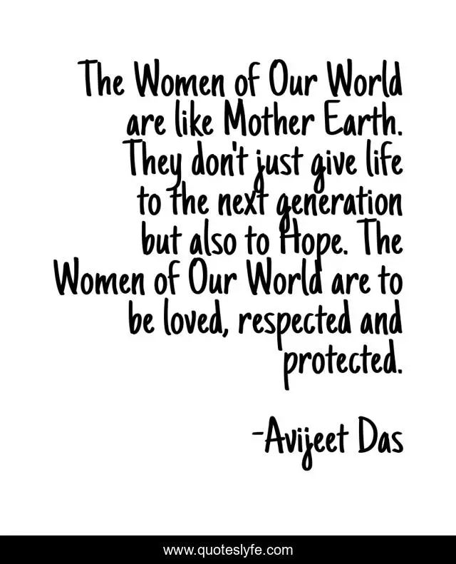 This page presents the quote "The Women of Our World are like Mother Earth. They don't just give life to the next generation but also to Hope. The Women of Our World are to be loved, respected and protected.". Author of this quote is Avijeet Das. This quote is about respect, protect, woman, mother-earth, world,.