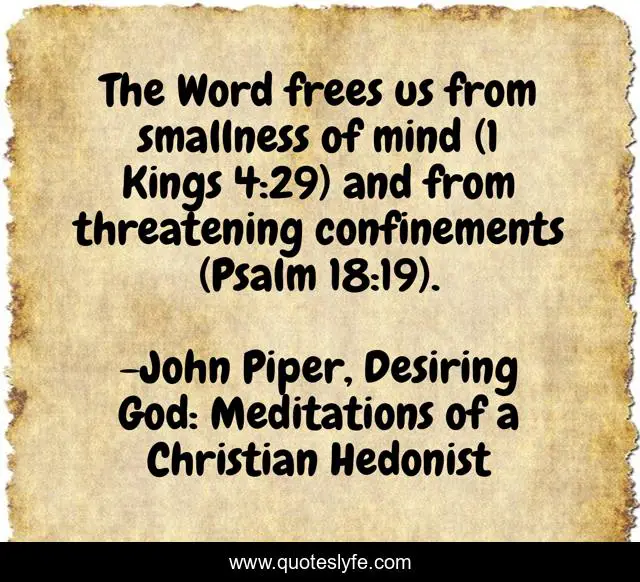 This page presents the quote "The Word frees us from smallness of mind (1 Kings 4:29) and from threatening confinements (Psalm 18:19).". Author of this quote is John Piper, Desiring God: Meditations of a Christian Hedonist. This quote is about open-mindedness, freedom, life, word, living,.