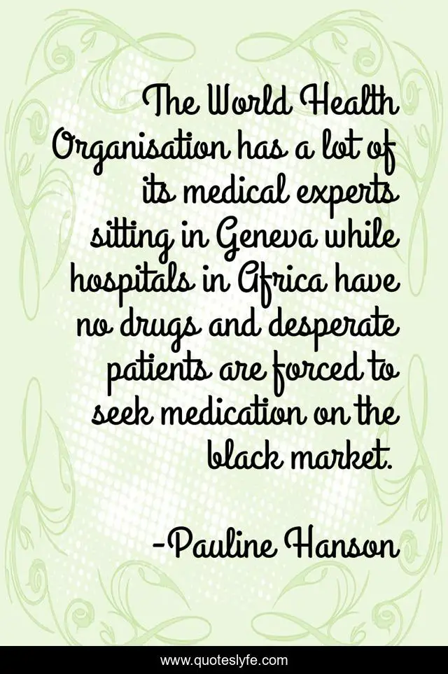 This page presents the quote "The World Health Organisation has a lot of its medical experts sitting in Geneva while hospitals in Africa have no drugs and desperate patients are forced to seek medication on the black market.". Author of this quote is Pauline Hanson. This quote is about world, health, black,.
