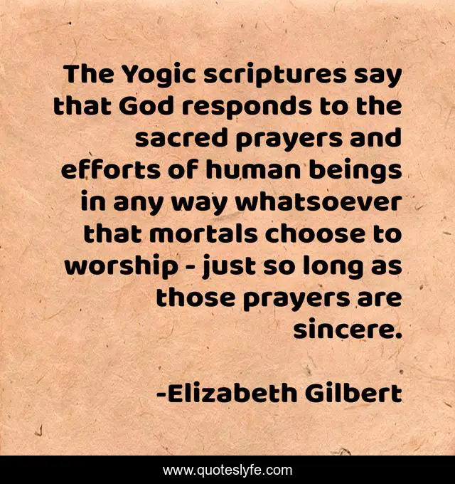This page presents the quote "The Yogic scriptures say that God responds to the sacred prayers and efforts of human beings in any way whatsoever that mortals choose to worship - just so long as those prayers are sincere.". Author of this quote is Elizabeth Gilbert. .