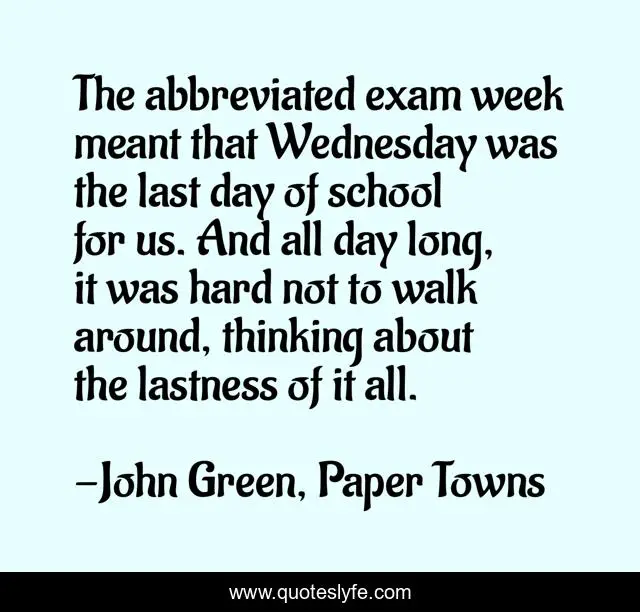 This page presents the quote "The abbreviated exam week meant that Wednesday was the last day of school for us. And all day long, it was hard not to walk around, thinking about the lastness of it all.". Author of this quote is John Green, Paper Towns. .