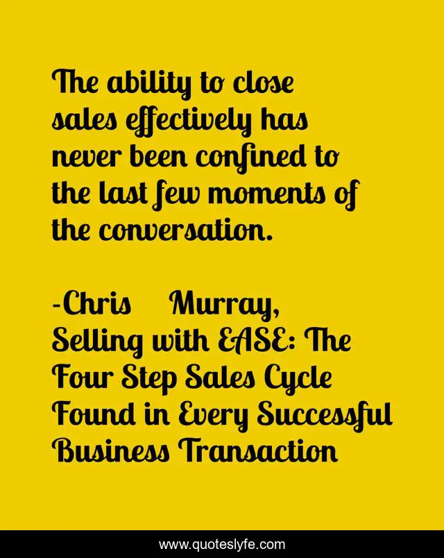 This page presents the quote "The ability to close sales effectively has never been confined to the last few moments of the conversation.". Author of this quote is Chris Murray, Selling with EASE: The Four Step Sales Cycle Found in Every Successful Business Transaction. This quote is about business-success, negotiation, sales-effectiveness, selling, business-advice, sales-training, business, influence, sales,.