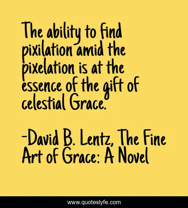 This page presents the quote "The ability to find pixilation amid the pixelation is at the essence of the gift of celestial Grace.". Author of this quote is David B. Lentz, The Fine Art of Grace: A Novel. This quote is about pixilation, david-b-lentz, art, grace, pixelation,.