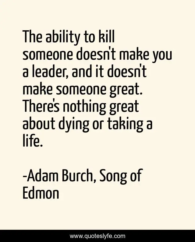 This page presents the quote "The ability to kill someone doesn't make you a leader, and it doesn't make someone great. There's nothing great about dying or taking a life.". Author of this quote is Adam Burch, Song of Edmon. This quote is about greatness, leadership, killing,.