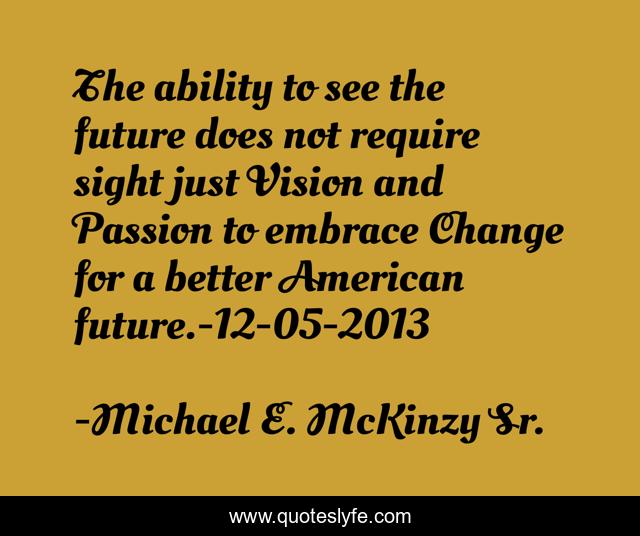This page presents the quote "The ability to see the future does not require sight just Vision and Passion to embrace Change for a better American future.-12-05-2013". Author of this quote is Michael E. McKinzy Sr.. .