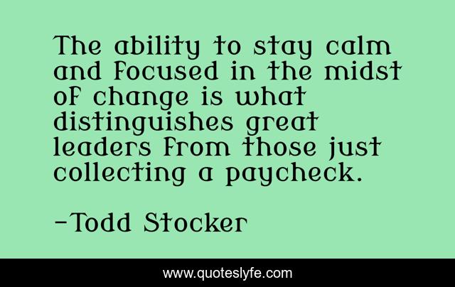 This page presents the quote "The ability to stay calm and focused in the midst of change is what distinguishes great leaders from those just collecting a paycheck.". Author of this quote is Todd Stocker. This quote is about motivation, leaders, leadership-development, focus, calmness, calm,.