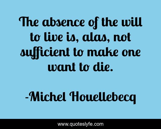 This page presents the quote "The absence of the will to live is, alas, not sufficient to make one want to die.". Author of this quote is Michel Houellebecq. This quote is about life, death, boredom, inspirational, misery, enthusiasm,.
