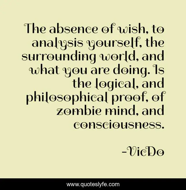 This page presents the quote "The absence of wish, to analysis yourself, the surrounding world, and what you are doing. Is the logical, and philosophical proof, of zombie mind, and consciousness.". Author of this quote is VicDo. This quote is about zombie, wish, absence, proof, world,.