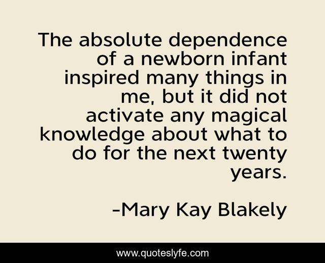 This page presents the quote "The absolute dependence of a newborn infant inspired many things in me, but it did not activate any magical knowledge about what to do for the next twenty years.". Author of this quote is Mary Kay Blakely. This quote is about me, newborn, years,.