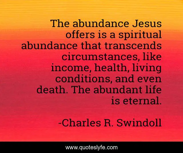 This page presents the quote "The abundance Jesus offers is a spiritual abundance that transcends circumstances, like income, health, living conditions, and even death. The abundant life is eternal.". Author of this quote is Charles R. Swindoll. This quote is about jesus-christ, christianity,.