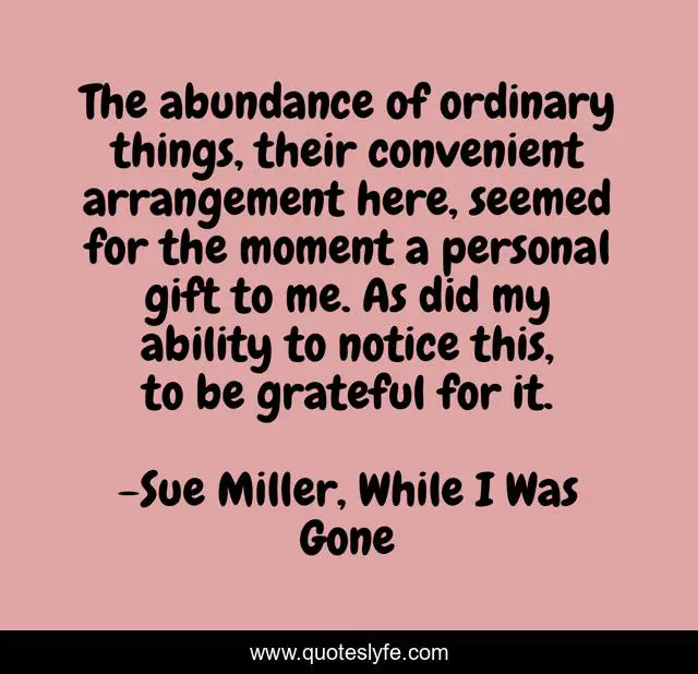 This page presents the quote "The abundance of ordinary things, their convenient arrangement here, seemed for the moment a personal gift to me. As did my ability to notice this, to be grateful for it.". Author of this quote is Sue Miller, While I Was Gone. This quote is about gratitude, ordinary-things, sue-miller, while-i-was-gone,.