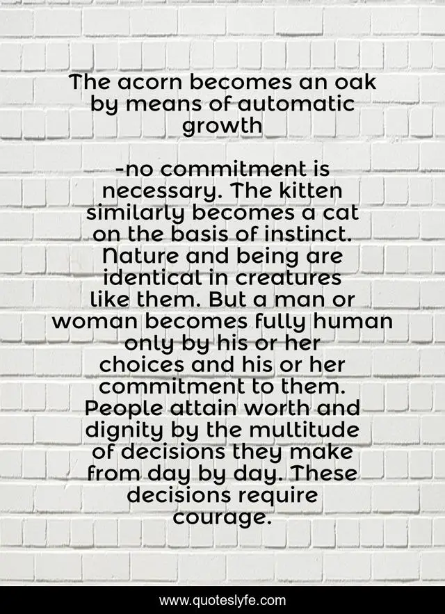 "no commitment is necessary. The kitten similarly becomes a cat on the basis of instinct. Nature and being are identical in creatures like them. But a man or woman becomes fully human only by his or her choices and his or her commitment to them. People attain worth and dignity by the multitude of decisions they make from day by day. These decisions require courage. Quotes." Quoteslyfe.com, 2025. Fri. 05 Dec. 2025. <https://www.quoteslyfe.com/quote/The-acorn-becomes-an-oak-by-means-91281>.