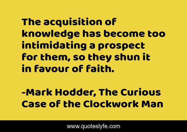 This page presents the quote "The acquisition of knowledge has become too intimidating a prospect for them, so they shun it in favour of faith.". Author of this quote is Mark Hodder, The Curious Case of the Clockwork Man. This quote is about faith, knowledge,.