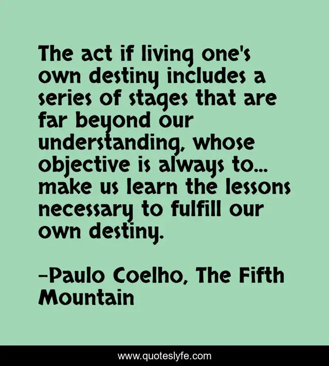 This page presents the quote "The act if living one's own destiny includes a series of stages that are far beyond our understanding, whose objective is always to... make us learn the lessons necessary to fulfill our own destiny.". Author of this quote is Paulo Coelho, The Fifth Mountain. This quote is about faith, life, destiny, fate, inspirational, enthusiasm,.