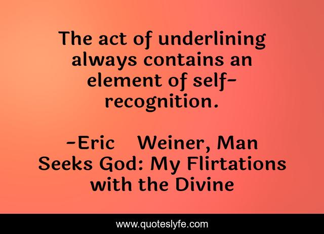 This page presents the quote "The act of underlining always contains an element of self-recognition.". Author of this quote is Eric Weiner, Man Seeks God: My Flirtations with the Divine. This quote is about self, books,.