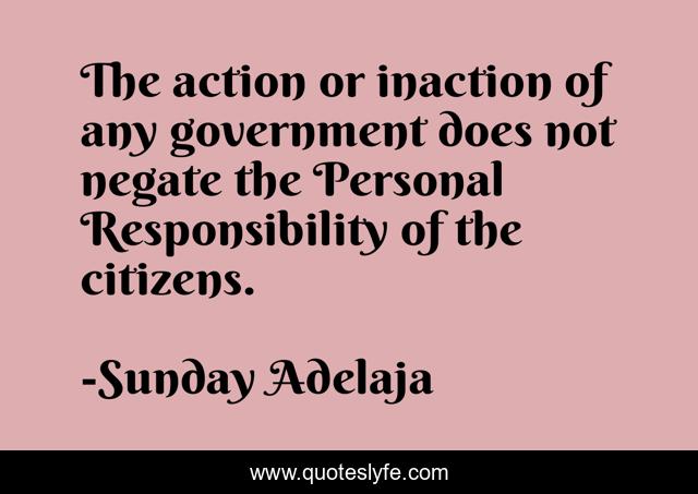 This page presents the quote "The action or inaction of any government does not negate the Personal Responsibility of the citizens.". Author of this quote is Sunday Adelaja. This quote is about action, responsibility, citizen,.