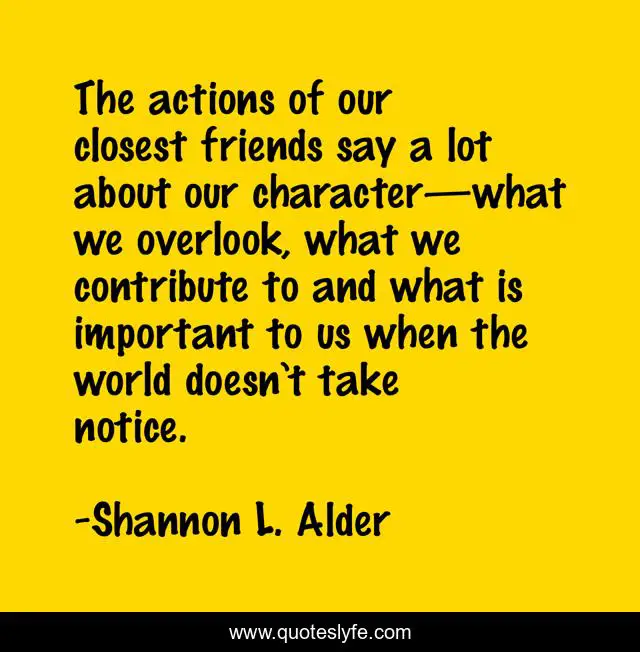 This page presents the quote "The actions of our closest friends say a lot about our character—what we overlook, what we contribute to and what is important to us when the world doesn’t take notice.". Author of this quote is Shannon L. Alder. This quote is about associations, morals, character, actions, values, quality, best-friends,.