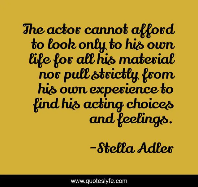 This page presents the quote "The actor cannot afford to look only to his own life for all his material nor pull strictly from his own experience to find his acting choices and feelings.". Author of this quote is Stella Adler. This quote is about life, acting, choices,.