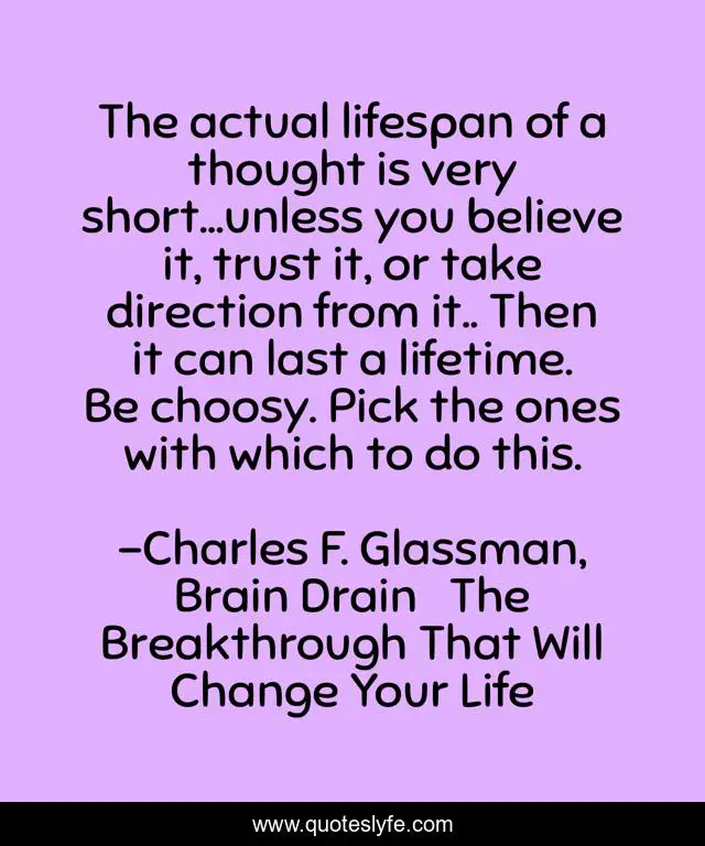 This page presents the quote "The actual lifespan of a thought is very short…unless you believe it, trust it, or take direction from it.. Then it can last a lifetime. Be choosy. Pick the ones with which to do this.". Author of this quote is Charles F. Glassman, Brain Drain The Breakthrough That Will Change Your Life. This quote is about life, success, thought-control, inspirational, enthusiasm, thoughts,.