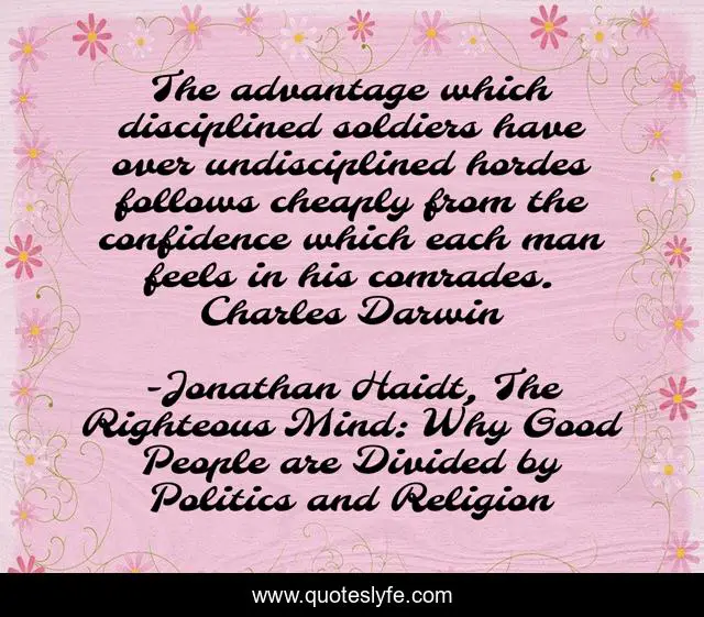 This page presents the quote "The advantage which disciplined soldiers have over undisciplined hordes follows cheaply from the confidence which each man feels in his comrades. Charles Darwin". Author of this quote is Jonathan Haidt, The Righteous Mind: Why Good People are Divided by Politics and Religion. This quote is about discipleship, community,.