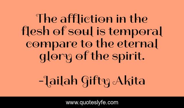 This page presents the quote "The affliction in the flesh of soul is temporal compare to the eternal glory of the spirit.". Author of this quote is Lailah Gifty Akita. This quote is about faith, christian, god, soul, inspirational, affliction, enthusiasm, pain, spirit,.