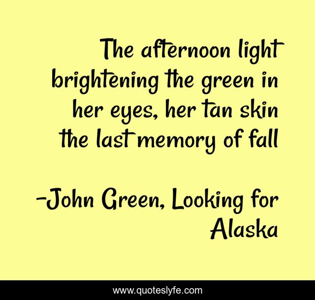 This page presents the quote "The afternoon light brightening the green in her eyes, her tan skin the last memory of fall". Author of this quote is John Green, Looking for Alaska. This quote is about romance, young-adult-fiction, tragedy,.