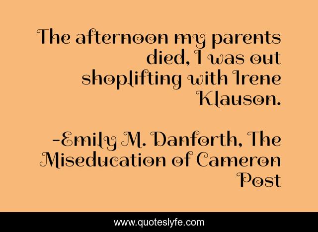 This page presents the quote "The afternoon my parents died, I was out shoplifting with Irene Klauson.". Author of this quote is Emily M. Danforth, The Miseducation of Cameron Post. This quote is about death, trauma-experiences, childhood,.