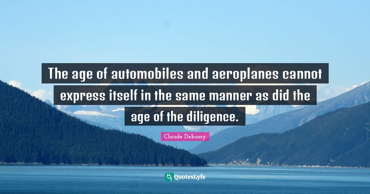 This page presents the quote "The age of automobiles and aeroplanes cannot express itself in the same manner as did the age of the diligence.". Author of this quote is Claude Debussy. This quote is about age, automobile, aeroplanes, diligence,.