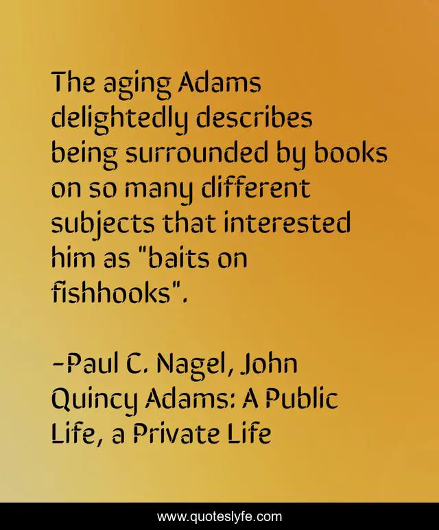 This page presents the quote "The aging Adams delightedly describes being surrounded by books on so many different subjects that interested him as "baits on fishhooks".". Author of this quote is Paul C. Nagel, John Quincy Adams: A Public Life, a Private Life. This quote is about concentration, reading, focus, curiosity,.
