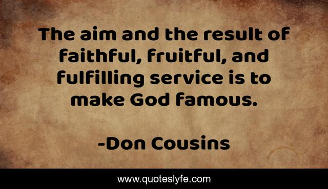 This page presents the quote "The aim and the result of faithful, fruitful, and fulfilling service is to make God famous.". Author of this quote is Don Cousins. This quote is about biblical-leadership, church-leaders, ministry-success, service, pastoral-leadership,.
