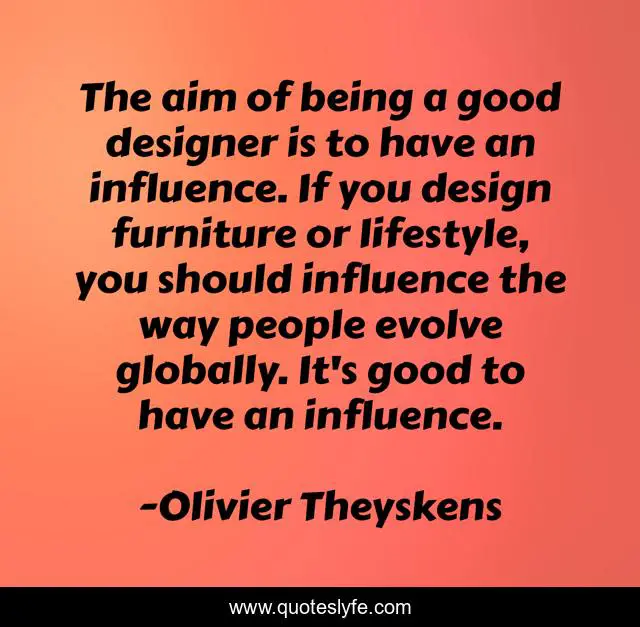 This page presents the quote "The aim of being a good designer is to have an influence. If you design furniture or lifestyle, you should influence the way people evolve globally. It's good to have an influence.". Author of this quote is Olivier Theyskens. This quote is about good, influence, people,.