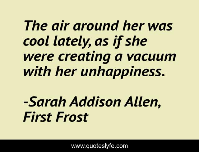 This page presents the quote "The air around her was cool lately, as if she were creating a vacuum with her unhappiness.". Author of this quote is Sarah Addison Allen, First Frost. This quote is about stress, unhappy, sad, sadness, stressed, worry,.