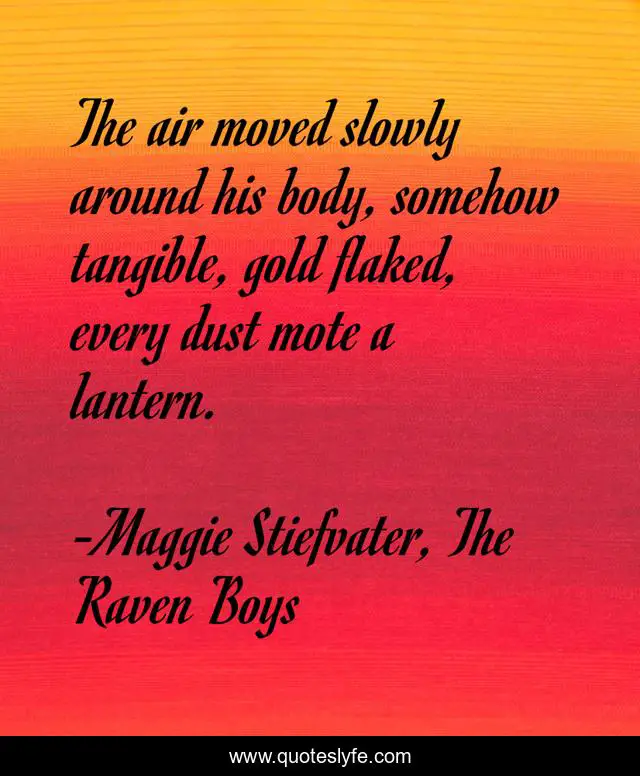 This page presents the quote "The air moved slowly around his body, somehow tangible, gold flaked, every dust mote a lantern.". Author of this quote is Maggie Stiefvater, The Raven Boys. This quote is about beautiful, figurative,.