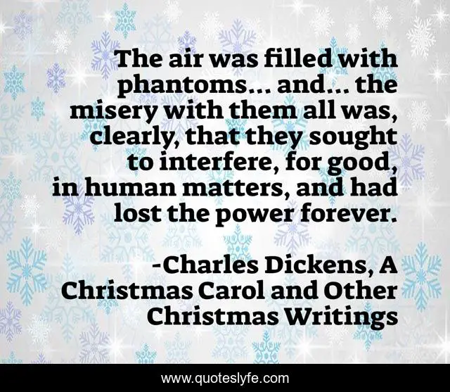This page presents the quote "The air was filled with phantoms... and... the misery with them all was, clearly, that they sought to interfere, for good, in human matters, and had lost the power forever.". Author of this quote is Charles Dickens, A Christmas Carol and Other Christmas Writings. This quote is about death, kindness, procrastination, service,.