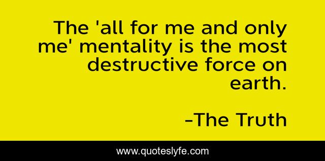This page presents the quote "The 'all for me and only me' mentality is the most destructive force on earth.". Author of this quote is The Truth. This quote is about the-truth, the-truth-will-set-you-free, sharing, the-truth-about-greed, share, greedy, ad-infinitum, earth, greed,.